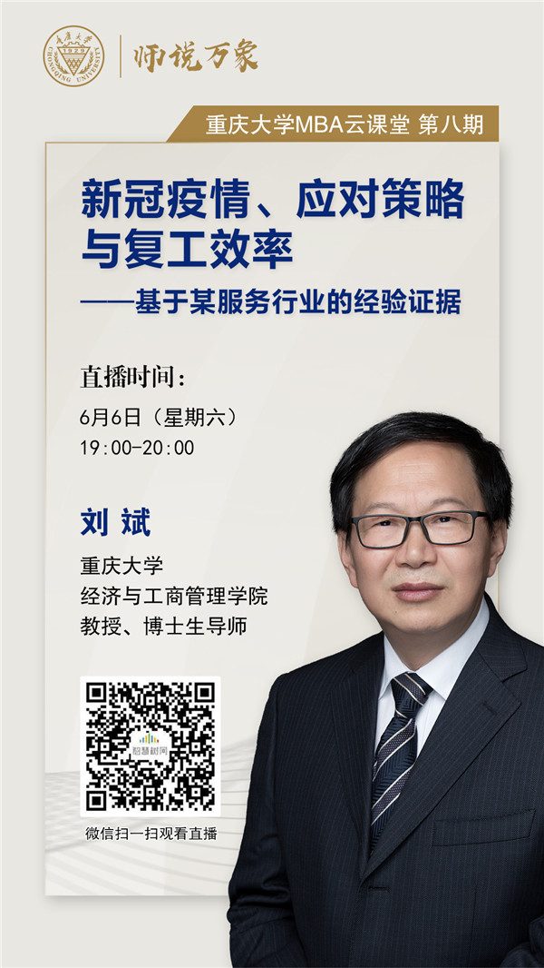 2020年6月6日(周六)19:00-20:00,重慶大學(xué)MBA中心網(wǎng)絡(luò)公開課系列——師說萬象推出第八期內(nèi)容,重慶大學(xué)教授、博士生導(dǎo)師劉斌,將以“新冠疫情、應(yīng)對策略與復(fù)工效率”為主題,以某服務(wù)行業(yè)的真實數(shù)據(jù)為例,對疫情響應(yīng)、人口流動、政策總結(jié)、策略應(yīng)對以及地理距離、服務(wù)延遲和模型檢驗等進(jìn)行深入分析與探討。