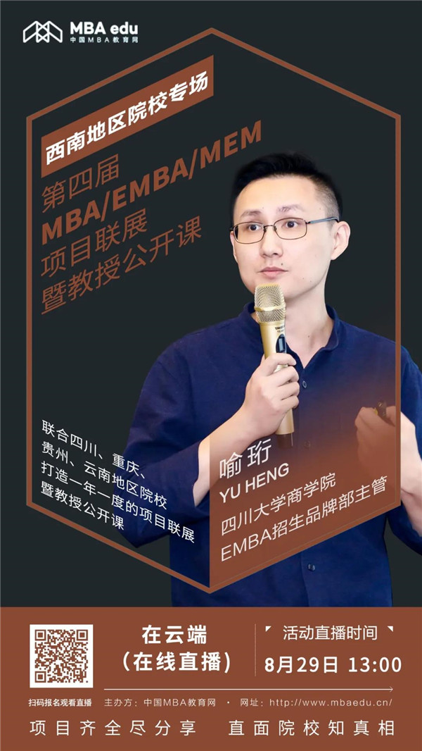 為給2021級(jí)考生提供更加全面、有用的招考信息,中國(guó)MBA教育網(wǎng)特別聯(lián)合四川大學(xué)EMBA,舉辦第四屆全國(guó)MBA/EMBA項(xiàng)目聯(lián)展暨教授公開(kāi)課(西南地區(qū)專場(chǎng)),旨在打通院校和考生之間的信息壁壘,搭建院校及考生之間的高效的交流平臺(tái)。考生可足不出戶盡知四川大學(xué)EMBA項(xiàng)目招生政策。