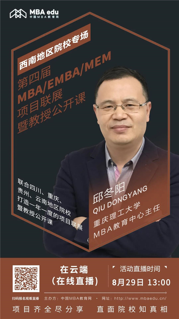 宣講嘉賓 邱東陽 重慶理工大學(xué)MBA教育中心主任 活動主題 第四屆全國MBA/EMBA/MEM項(xiàng)目聯(lián)展暨教授公開課(西南地區(qū)專場) 活動時間 2020年8月29日 13:00 活動入口 長按識別上方二維碼,收藏直播間 此前,中國MBA教育網(wǎng)已聯(lián)合全國百余所商學(xué)院,開展線上招生政策宣講直播峰會,至今已成功舉辦多場線上直播,財(cái)經(jīng)類院校專場、中部地區(qū)院校專場及西北地區(qū)院校專場等,8月初更是成功舉辦了2020年首場線下會議(長三角專場),得到大多院校老師、考生們的廣泛關(guān)注和好評。