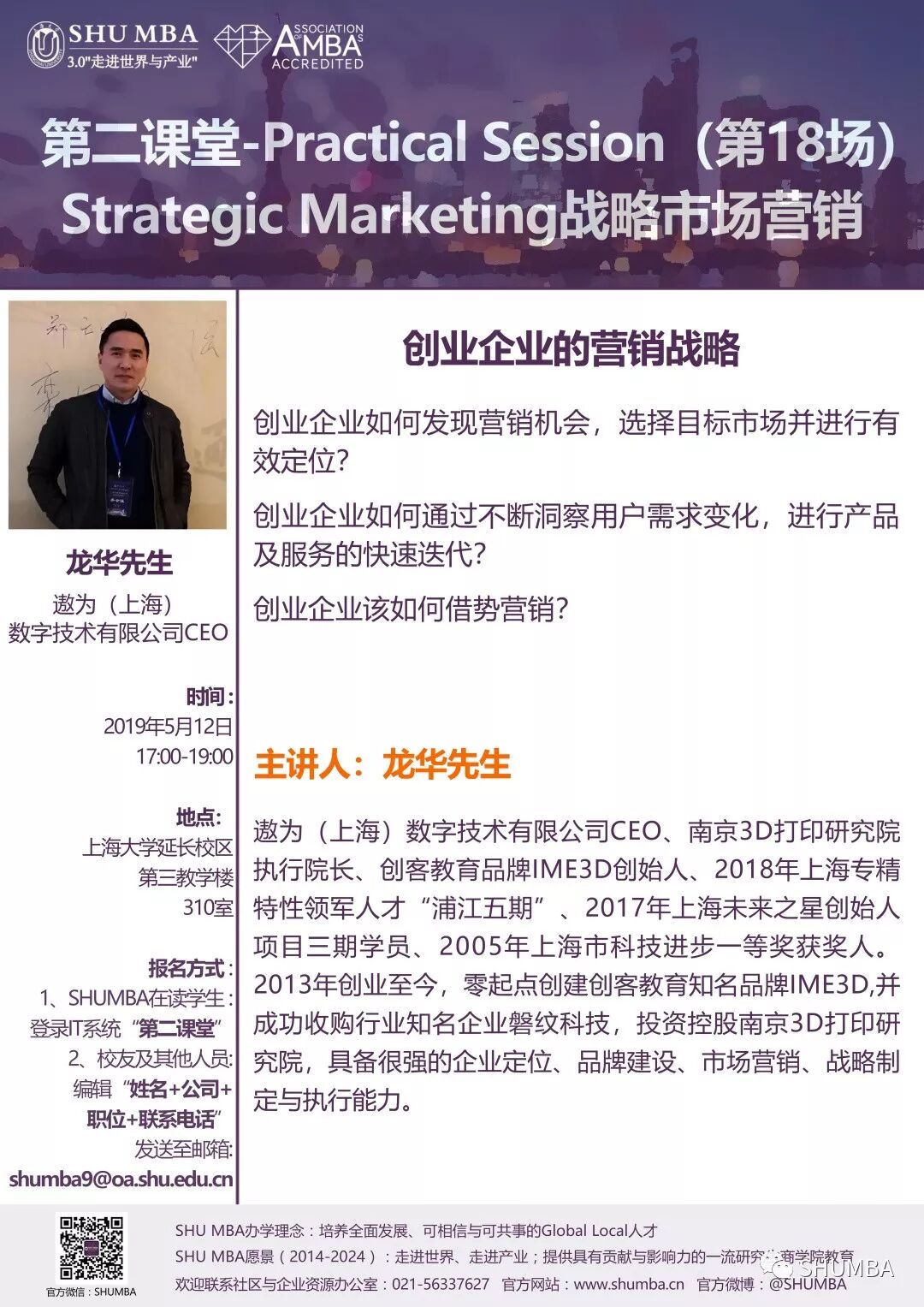 5月12日下午,SHU MBA Practical Session 第18場給你答案!屆時,遨為(上海)數(shù)字技術有限公司CEO、南京3D打印研究院執(zhí)行院長、創(chuàng)客教育品牌IME3D創(chuàng)始人——龍華先生將為大家?guī)怼皠?chuàng)業(yè)企業(yè)的營銷戰(zhàn)略”主題講座。學以致用,跟著大咖開拓視野,SHU MBA等你來!