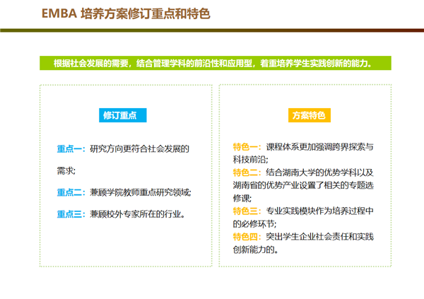 新時代,新商科,新發(fā)展,湖南大學(xué)開啟行業(yè)領(lǐng)導(dǎo)者和領(lǐng)域管理人才商科培養(yǎng)新模式,構(gòu)建一流MBA/EMBA人才培養(yǎng)教育體系,實現(xiàn)湖南大學(xué)MBA/EMBA一流人才培養(yǎng)目標(biāo)。