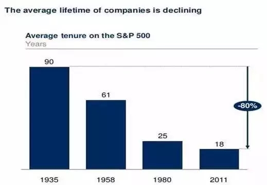 我們可以看到,標(biāo)準(zhǔn)普爾500指數(shù),1935年上市公司的平均壽命是90年,到了2011年上市公司的平均壽命卻只有18年。