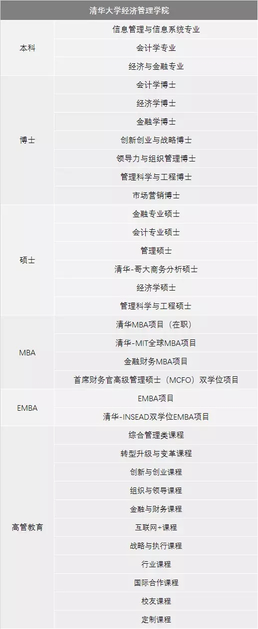 清華經(jīng)管學(xué)院的教學(xué)項(xiàng)目主要包含本科、碩士、博士、MBA、EMBA、高管教育和清華x-空間(x-lab)。清華五道口金融學(xué)院的教學(xué)項(xiàng)目包含金融學(xué)博士、金融專業(yè)碩士、本科輔修、金融MBA、金融EMBA、全球金融GFD和高管教育。