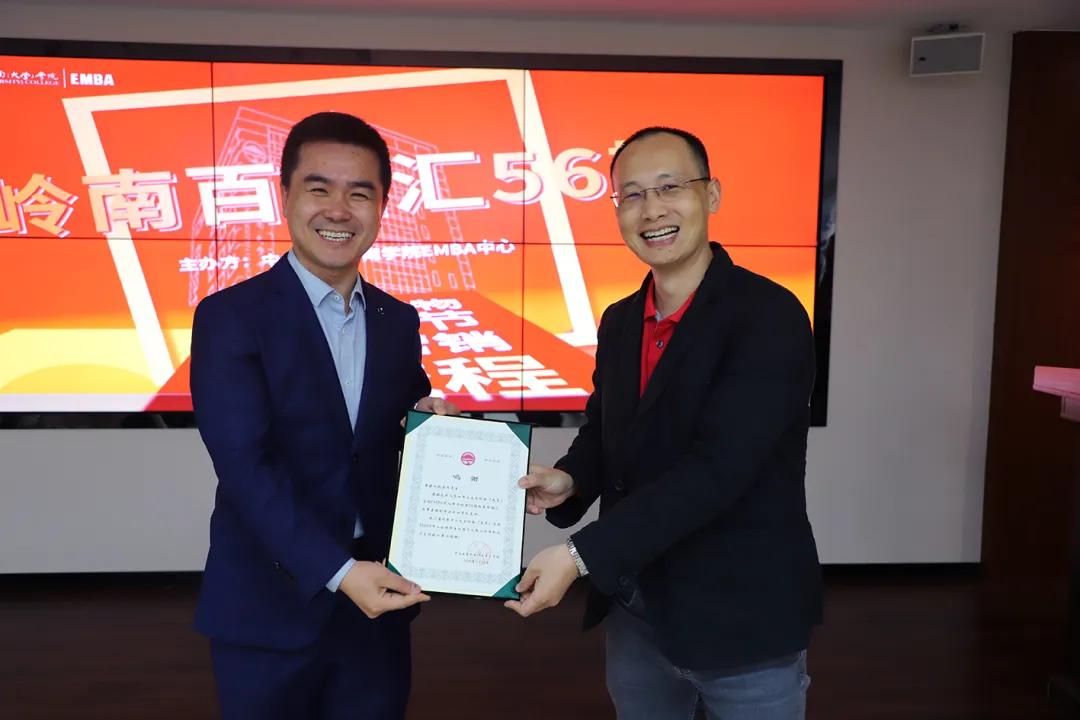 講座伊始,全體起立奏唱中山大學(xué)校歌。隨后,EMBA中心主任鄔金濤副教授代表學(xué)院向分享嘉賓贈(zèng)送鳴謝函。同時(shí),也感謝11夏鐘衛(wèi)紅校友提供的場(chǎng)地。