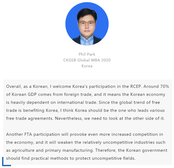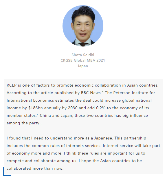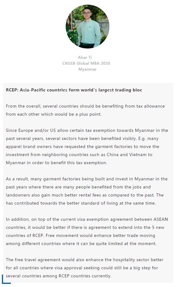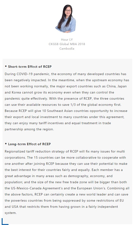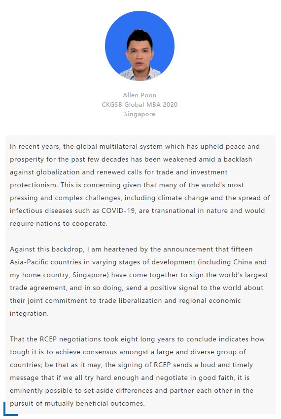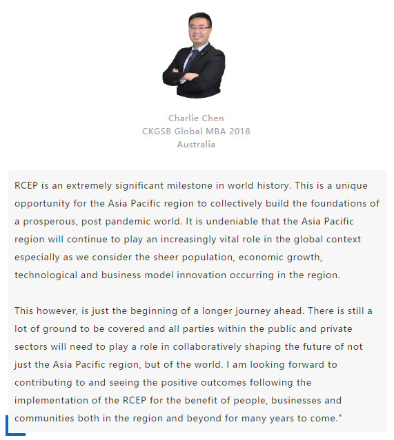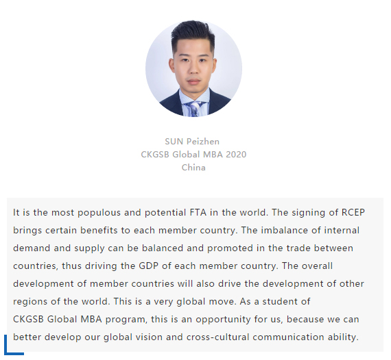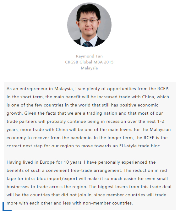 【中國MBA教育網(wǎng)訊】近日,經(jīng)過八年的艱苦談判,中國、日本、韓國、澳大利亞、新西蘭和東盟十國共15國通過視頻簽署《區(qū)域全面經(jīng)濟(jì)伙伴關(guān)系協(xié)定》(RCEP),宣告亞太區(qū)域全面經(jīng)濟(jì)伙伴關(guān)系組織成立。 該區(qū)域組織以消除關(guān)稅和非關(guān)稅貿(mào)易壁壘、促進(jìn)投資便利化和自由化為重要目標(biāo),通過構(gòu)建RCEP,彰顯對自由貿(mào)易和多邊體制的堅定支持,在世界經(jīng)濟(jì)形勢復(fù)雜多變的背景下,RCEP致力于共同打造一個跨區(qū)域的、寬領(lǐng)域、高質(zhì)量的貿(mào)易和投資環(huán)境。 RCEP協(xié)定作為一個現(xiàn)代、全面、高水平和互惠的協(xié)定,覆蓋人口23億人,占全球人口的30%,成員國GDP總和達(dá)25.6萬億美元,占全球總量的29.3%,區(qū)域內(nèi)貿(mào)易額為10.4萬億美元,占全球總貿(mào)易額的27.4%,是目前全球涵蓋人口最多、經(jīng)濟(jì)總量最大、貿(mào)易額最多的自貿(mào)協(xié)定。 RCEP向投資者發(fā)出一個重要信號,即該地區(qū)仍決心推進(jìn)多邊貿(mào)易一體化。這一舉措使得區(qū)域內(nèi)商品流通更加順暢。鑒于韓國、日本將大量生產(chǎn)基地設(shè)在東南亞,未來區(qū)域價值鏈將不斷融合、升級,推動區(qū)域經(jīng)濟(jì)全面創(chuàng)新發(fā)展。 RCEP為全球經(jīng)濟(jì)增長及多邊貿(mào)易一體化帶來利好,同時也凸顯中國拉動區(qū)域經(jīng)濟(jì)流動、維護(hù)自由貿(mào)易的決心。該協(xié)定與“一帶一路”倡議相結(jié)合,將有助于中國構(gòu)建更加利于相關(guān)項目落地的經(jīng)濟(jì)空間,通過加強(qiáng)交通、能源、通信等領(lǐng)域的互聯(lián)互通,促進(jìn)地區(qū)經(jīng)濟(jì)協(xié)同發(fā)展。 長江商學(xué)院自成立以來,懷抱躋身世界一流商學(xué)院的夢想,一直以“為中國和世界培養(yǎng)一批具有全球視野與全球資源整合能力、人文關(guān)懷與社會擔(dān)當(dāng)以及創(chuàng)新精神的世界級商業(yè)領(lǐng)袖”為己任,為打造全球新一代商學(xué)院做出了一系列探索與創(chuàng)新。 長江商學(xué)院Global MBA項目一直以培養(yǎng)新生代經(jīng)濟(jì)顛覆式商業(yè)領(lǐng)袖為目標(biāo),通過引領(lǐng)式研究與原創(chuàng)商業(yè)洞見,實現(xiàn)多元思維碰撞與智慧啟迪。 RCEP的簽署對成員國有什么意義?來自8個成員國的Global MBA同學(xué)分享了他們的看法: