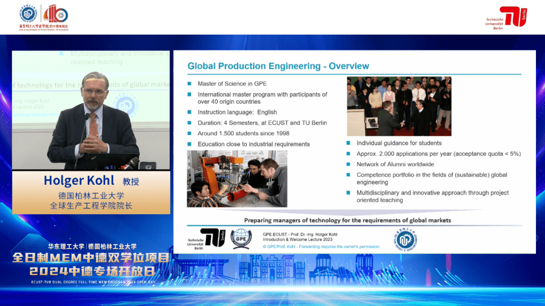 發(fā)布會伊始,董雙老師對中德雙學位MEM項目以及德國柏林工業(yè)大學全球生產(chǎn)工程學院院長Holger Kohl 進行了簡要介紹。她提到,融合德國柏林工業(yè)大學全球生產(chǎn)工程碩士與華東理工大學工程管理碩士優(yōu)勢課程開設的雙學位工程管理碩士項目,擁有融貫中西學術造詣深厚、教學經(jīng)驗豐富的師資團隊,課程體系兼具特色化、創(chuàng)新性、精細化與專業(yè)化,能有效培養(yǎng)學生將專業(yè)理論知識應用于解決實際問題的能力以及創(chuàng)新創(chuàng)業(yè)的能力。
