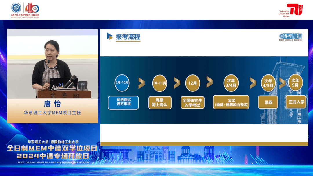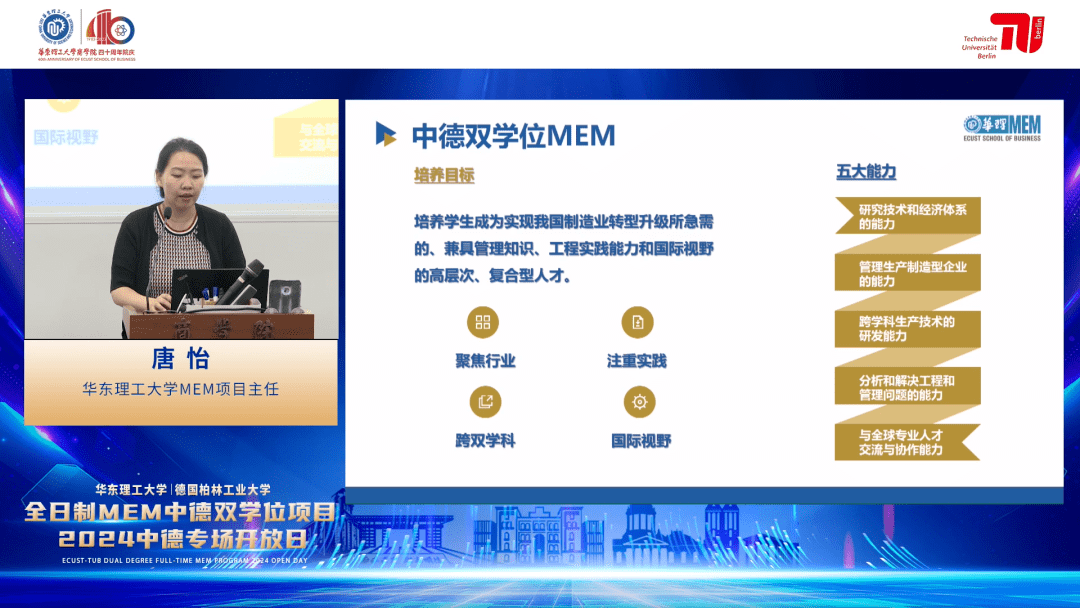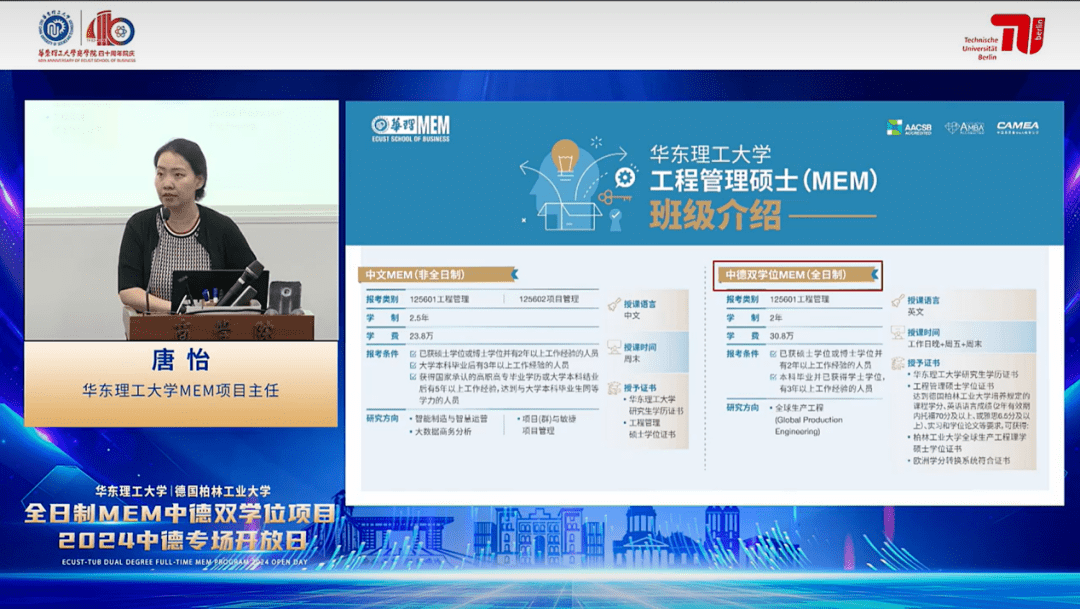 華東理工大學MEM項目主任唐怡老師圍繞項目設立背景、師資力量、課程體系、培養(yǎng)特色等內(nèi)容對中德雙學位MEM項目進行了全方位解讀。她表示,華理中德雙學位MEM是融合德國柏林工業(yè)大學全球生產(chǎn)工程理學碩士與華東理工大學工程管理碩士優(yōu)勢課程的雙學位碩士項目,是國內(nèi)稀缺的管理+工程跨學科雙學位碩士,被譽為“制造業(yè)的MBA”。項目引入德國先進理論知識和教學方法,致力于培養(yǎng)學生成為實現(xiàn)我國制造業(yè)轉型升級所急需的、兼具管理知識、工程實踐能力和國際視野的高層次、復合型人才。