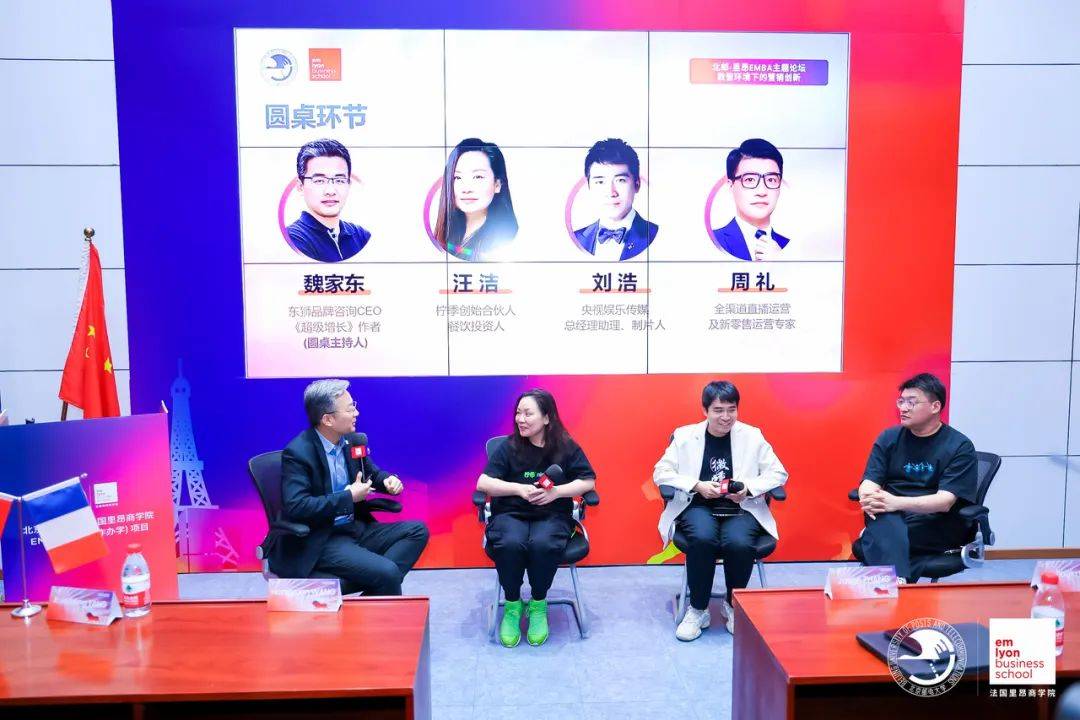 圓桌討論由東獅品牌咨詢CEO、《超級增長》作者、北郵-里昂EMBA2018級校友魏家東主持。央視娛樂傳媒總經(jīng)理助理、制片人、EMBA22級學(xué)生劉浩,檸季創(chuàng)始合伙人、EMBA23級學(xué)生汪潔,全渠道直播運營及新零售運營專家、EMBA22級學(xué)生周禮等四位學(xué)生圓桌嘉賓分別就“品牌營銷與市場營銷的關(guān)系”“企業(yè)營銷轉(zhuǎn)型創(chuàng)新點”“新零售和電商內(nèi)容直播”“數(shù)智化如何賦能企業(yè)發(fā)展”和“數(shù)智化未來構(gòu)想”等主題內(nèi)容進行了討論交流。觀點交鋒碰撞思維火花,現(xiàn)場氣氛活躍熱烈,高潮迭起,引發(fā)了大家的廣泛共鳴和深入思考。
