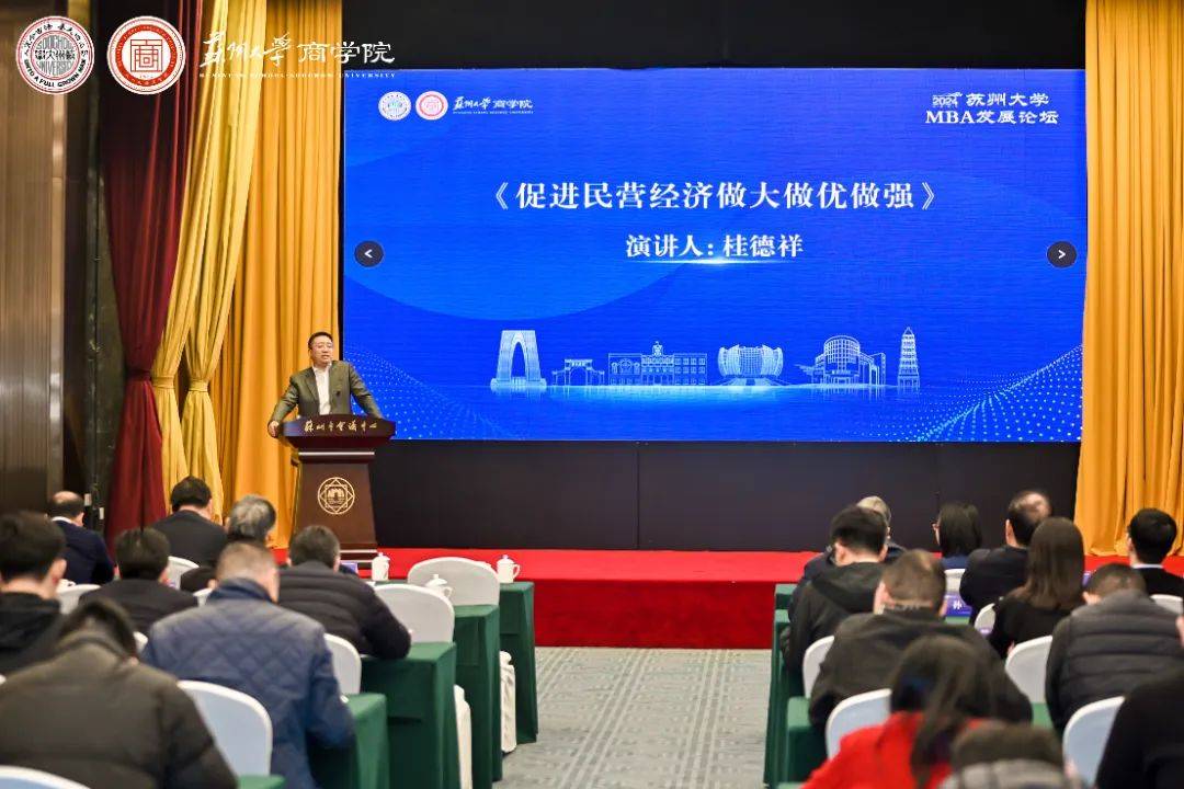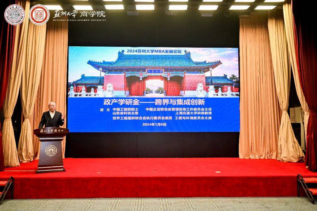 2024年1月6日,由蘇州大學(xué)MBA教育中心主辦,蘇州大學(xué)MBA聯(lián)合會(huì)、蘇州大學(xué)MBA校友會(huì)承辦的“2024蘇州大學(xué)MBA發(fā)展論壇暨迎新晚會(huì)”于蘇州會(huì)議中心成功舉辦。蘇州大學(xué)黨委常委、副校長(zhǎng)沈明榮,中國(guó)工程院院士、山東省科協(xié)主席、山東省原副省長(zhǎng)凌文,江蘇省工商聯(lián)副主席、一級(jí)巡視員桂德祥,中歐聯(lián)合投資有限公司副董事長(zhǎng)、中國(guó)國(guó)際關(guān)系學(xué)會(huì)理事、中國(guó)企業(yè)投資協(xié)會(huì)理事高志凱,蘇州大學(xué)國(guó)內(nèi)合作發(fā)展與合作處處長(zhǎng)、蘇州大學(xué)校友總會(huì)秘書(shū)長(zhǎng)陸岸,蘇州大學(xué)商學(xué)院黨委書(shū)記劉志明,院長(zhǎng)馮博等300余位領(lǐng)導(dǎo)嘉賓出席活動(dòng)。發(fā)展論壇由蘇州大學(xué)商學(xué)院副院長(zhǎng)、MBA教育中心主任王要玉主持。