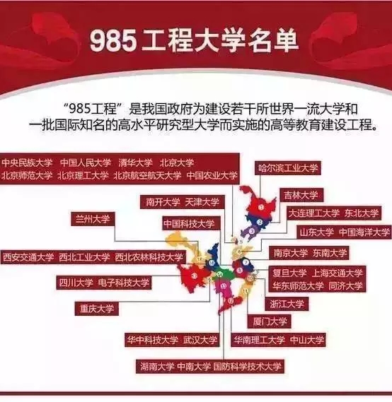 1998年5月4日,江澤民總書記在慶祝北大建校100周年大會上向全社會宣告:“為了實現(xiàn)現(xiàn)代化,我國要有若干所具有世界先進水平的一流大學(xué)。”為貫徹落實黨中央科教興國的戰(zhàn)略和江澤民同志的號召,教育部決定在實施“面向21世紀教育振興行動計劃”中,重點支持北京大學(xué)、清華大學(xué)等部分高等學(xué)校創(chuàng)建世界一流大學(xué)和高水平大學(xué),簡稱“985”工程。