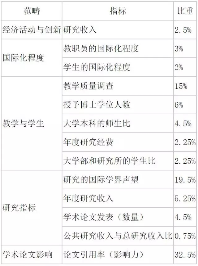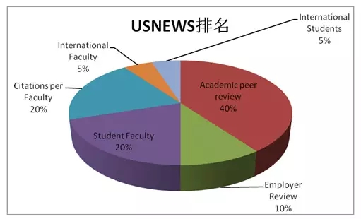 USNEWS的評分標(biāo)準(zhǔn),其中:學(xué)術(shù)能力和雇主滿意度分別占40%和10%,學(xué)校引文和師生利率分別占20%,國際學(xué)生與國際師資分占5%。