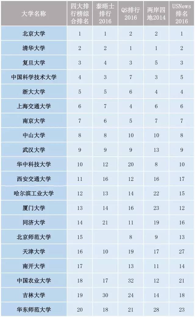 2016年中國大學(xué)綜合排行榜終極排名TOP 20