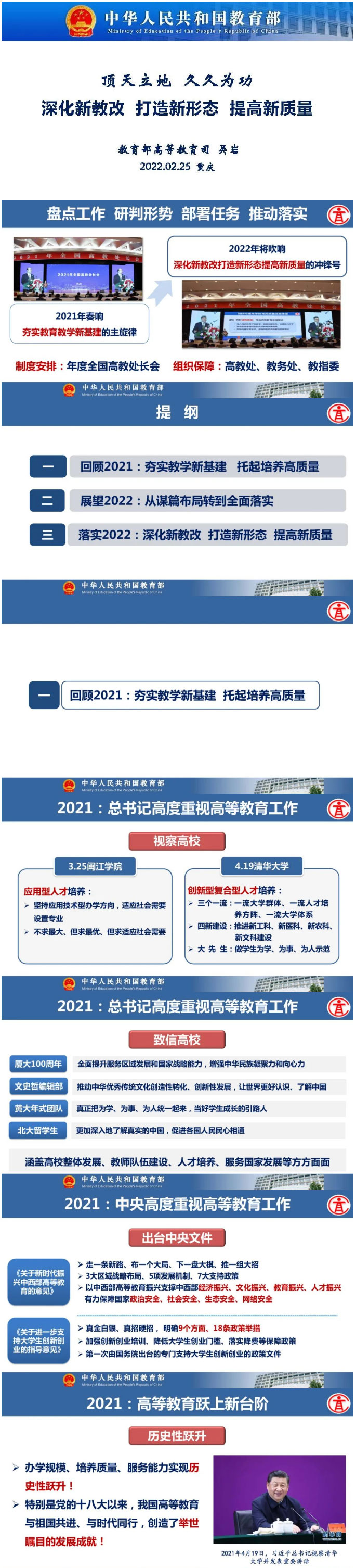 2月25日,2022年全國高教處長會在重慶市召開,旨在研究部署2022年度推進(jìn)高等教育高質(zhì)量發(fā)展重點(diǎn)工作,全面提升高等教育根本質(zhì)量、整體質(zhì)量、服務(wù)質(zhì)量,加快完善高等教育發(fā)展中國范式,走好人才自主培養(yǎng)之路。