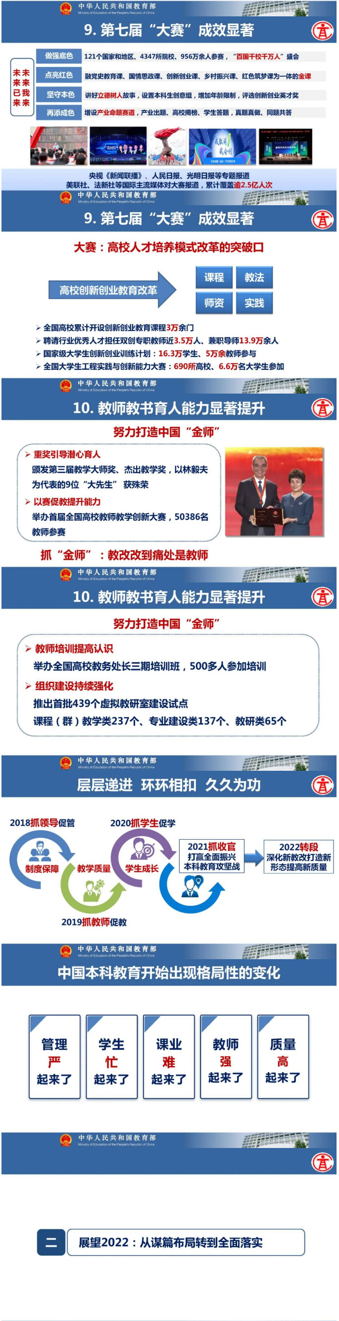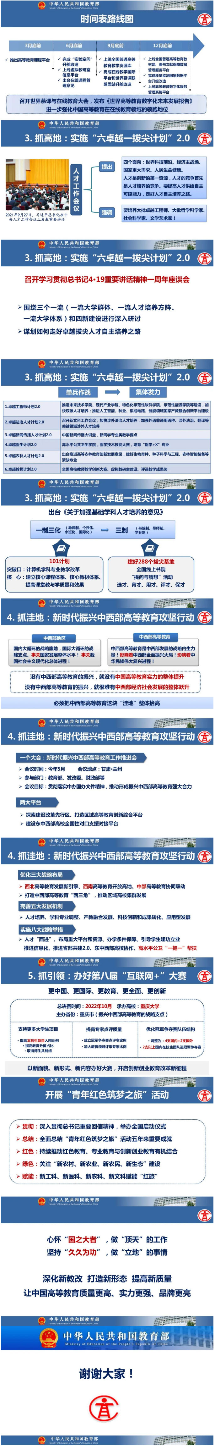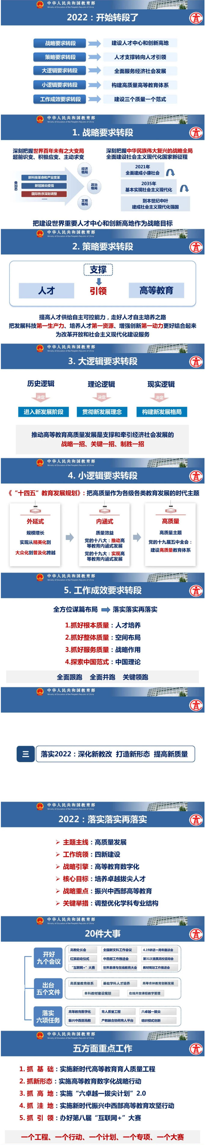 教育部高等教育司司長吳巖作主題報(bào)告,盤點(diǎn)總結(jié)2021年的工作,強(qiáng)調(diào)2022年要轉(zhuǎn)段:要從戰(zhàn)略上、策略上、大邏輯、小邏輯、工作成效上全面轉(zhuǎn)段。要抓基礎(chǔ)、抓新形態(tài)、抓高地、抓洼地、抓引領(lǐng),從實(shí)施新時(shí)代高等教育育人質(zhì)量工程、卓越拔尖人才培養(yǎng)、高等教育數(shù)字化、中西部高等教育振興、“互聯(lián)網(wǎng)+”大賽等五方面的戰(zhàn)略任務(wù),抓好20件大事的落實(shí),讓中國高等教育質(zhì)量更高、實(shí)力更強(qiáng)、品牌更亮!