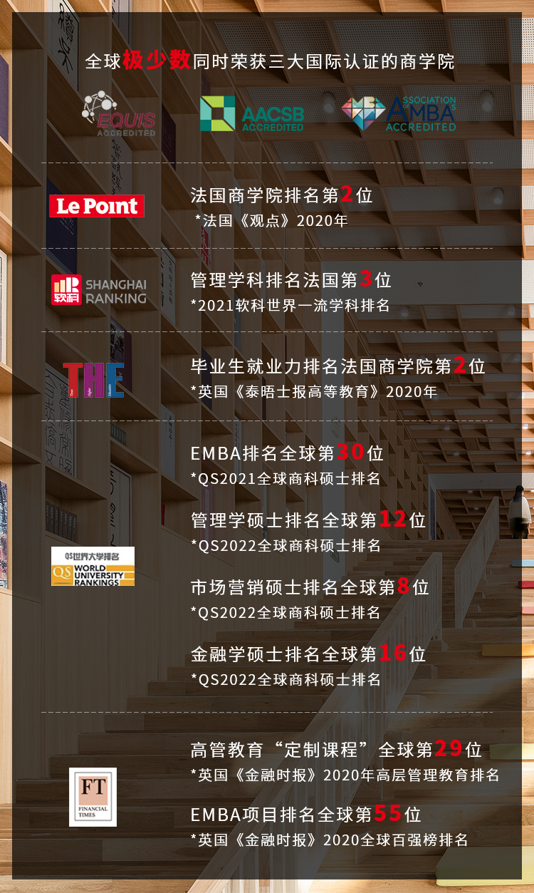 法國(guó)里昂商學(xué)院創(chuàng)立于1872年,是歐洲最古老的商學(xué)院之一,學(xué)校在全球三大洲共設(shè)有六大校區(qū),并在130個(gè)國(guó)家擁有超過(guò)32,000名校友。法國(guó)里昂商學(xué)院以為世界培養(yǎng)“創(chuàng)客先鋒”(early makers)為使命,始終將“創(chuàng)新”作為學(xué)校發(fā)展核心戰(zhàn)略。學(xué)校采取新一代教學(xué)方法,聚焦學(xué)術(shù)發(fā)展和教學(xué)模式的創(chuàng)新結(jié)合,積極開展卓越的學(xué)術(shù)研究,推進(jìn)創(chuàng)新型課程設(shè)置,取得了優(yōu)秀的教學(xué)成果,學(xué)校各項(xiàng)排名在全球商學(xué)院中名列前茅。